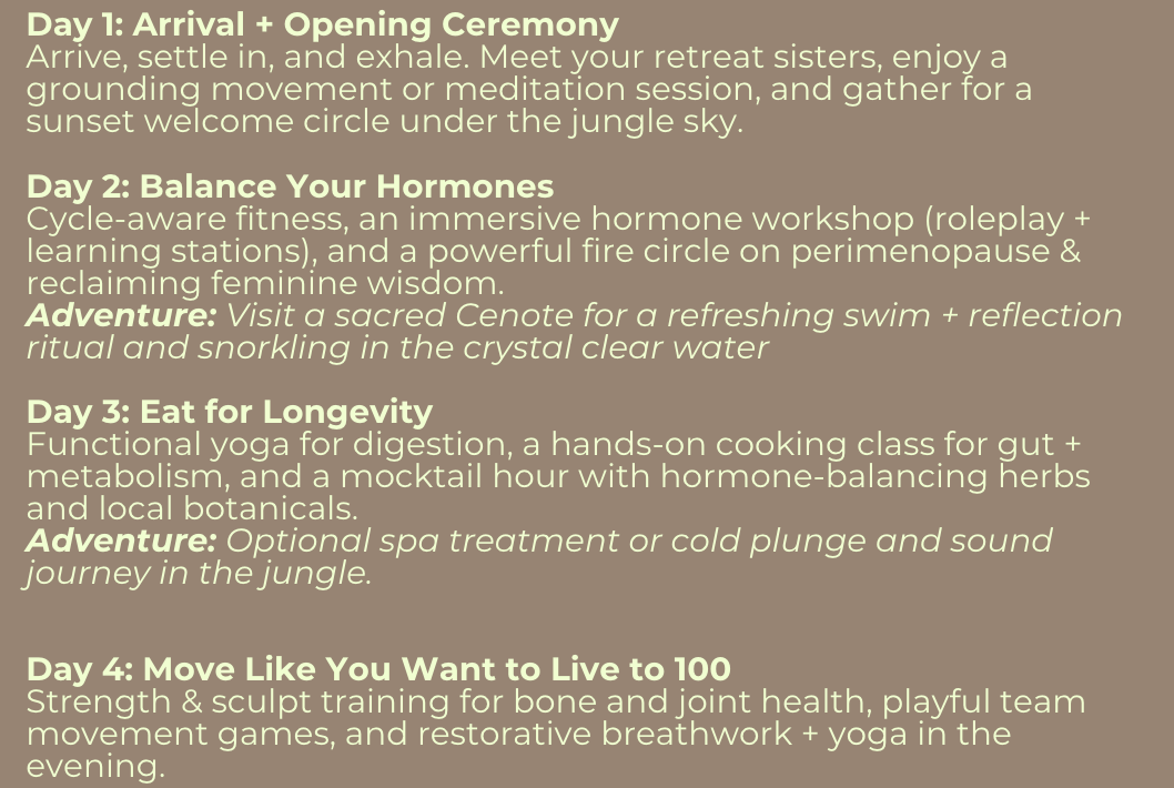 Personalized 90 day longevity blueprint to take home and gain deep knowledge of your own female physiology, personalized guidance from coaches after retreat, tools to prevent burnout and stay energized long-term. A renewed sense of self.